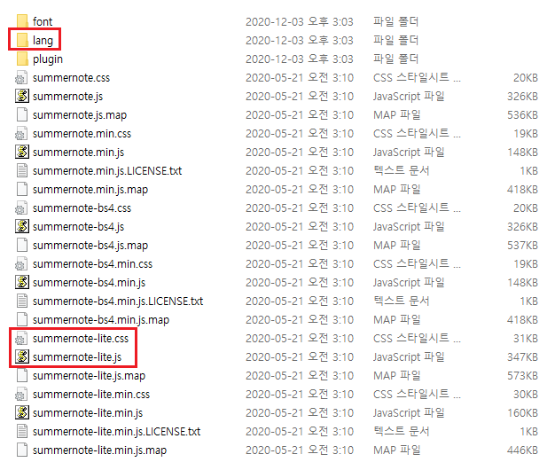 압축을 풀게 되면, lang폴더의 summernote-ko-KR.js(한국어설정) 와 라이트설정을 위해 summernote-lite.css , summernote-lite.js 파일을 import 합니다.