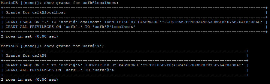 grant all privileges on usfk.* to abc@'localhost' identified by 'usfk123';