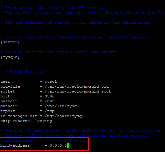 bind-address = 0.0.0.0 을 추가하고 저장한다.